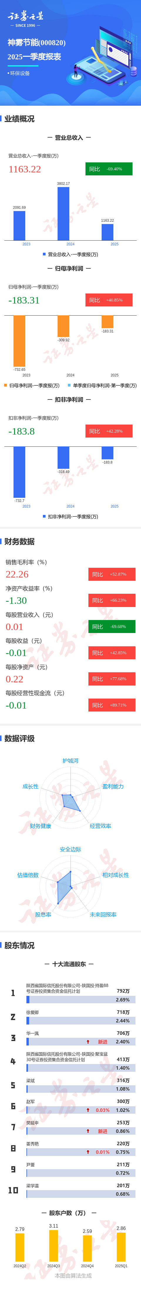 证券之星消息,神雾节能2025年一季报显示,公司主营收入1163.23万元,同比下降69.41%;归母净利润-183.31万元,同比上升40.85%;扣非净利润-183.81万元,同比上升42.29%;负债率49.0%,财务费用19.35万元,毛利率22.26%。